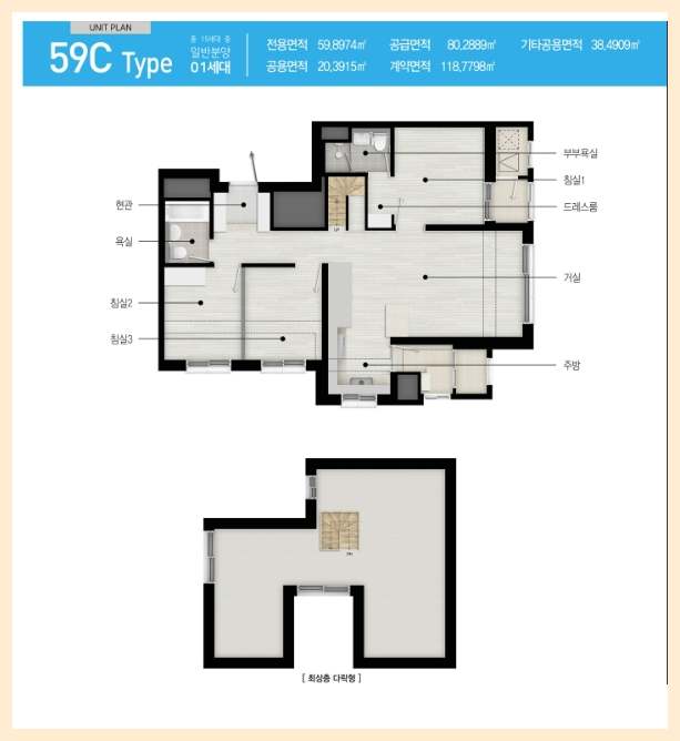 그러나 분양가 상한제가 적용되지 않은 지주택 단지임에도 84타입의 분양가가 5억 초반대로 책정되어 있어 가격 면에서는 괜찮은 편입니다. 특히 84타입뿐만 아니라 59타입에도 다락을 적용한 점이 눈에 띕니다.
