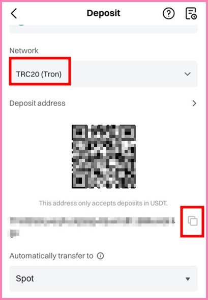 Copy the deposit address and send USDT from your local exchange.
